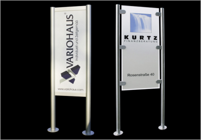 Die elegante Alternative wird aus Edelstahl gefertigt. Edelstahlpfosten in Verbindung mit einem Plexiglasschild sehen richtig hochwertig aus. Diese Schilder eig-