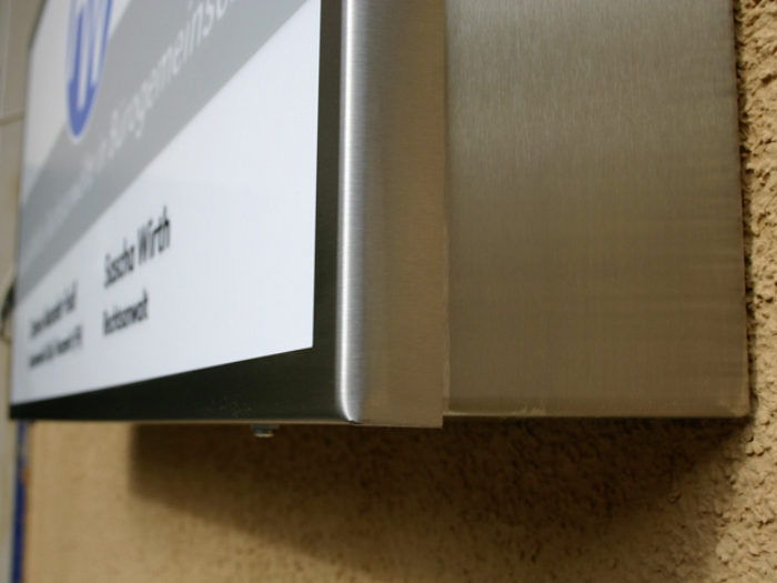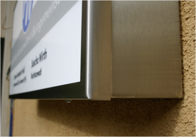 Wenn es für den Eingangsbereich etwas ganz besonders edles sein soll, können die Leuchtkästen auch aus Edelstahl hergestellt werden.